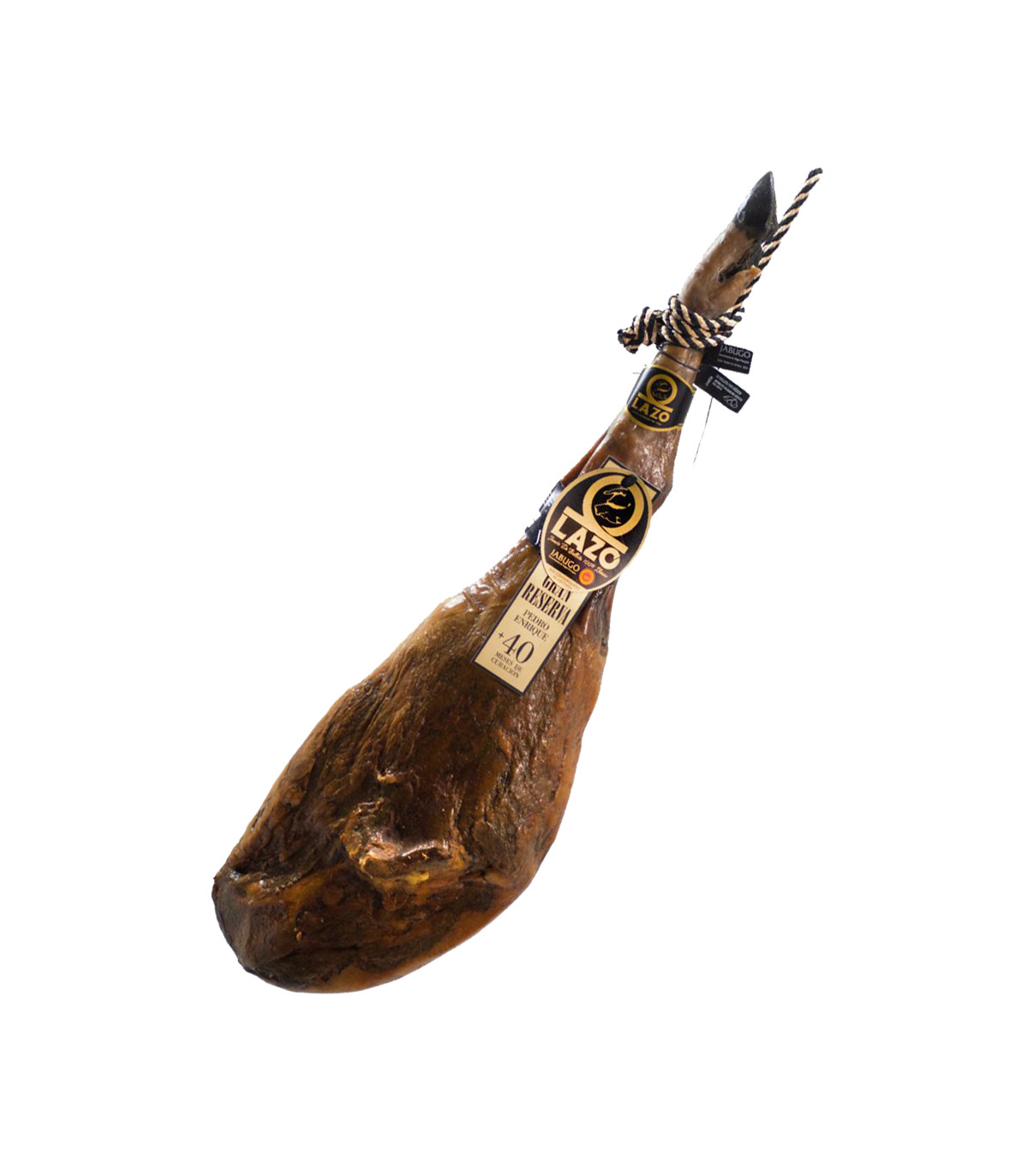 Éste jamón de Jabugo viene presentado en una funda negra con el logo de Lazo bordado en dorado y en una caja negra dándole un aspecto de elegancia y exclusividad.