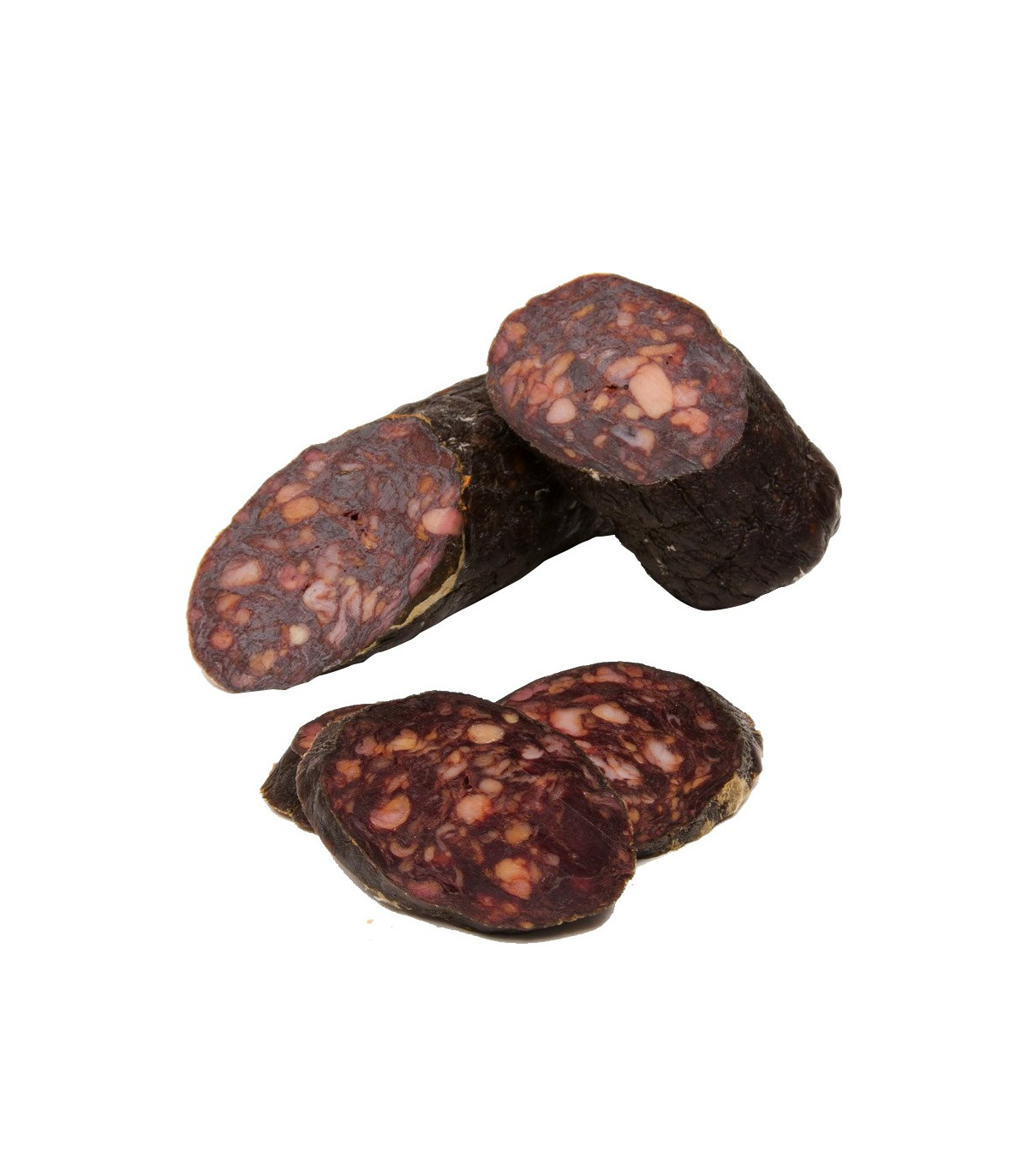 Morcilla ibérica en formato de vela, elaborada con carne, pimentón, sangre, ajo y grasa de cerdo ibérico de cebo.