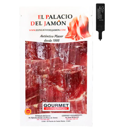 De los jamones de bellota 100% ibérico con Denominación de Origen de Jabugo Summum, se preparan estas raciones de jamón cortado a mano de 100 gr.