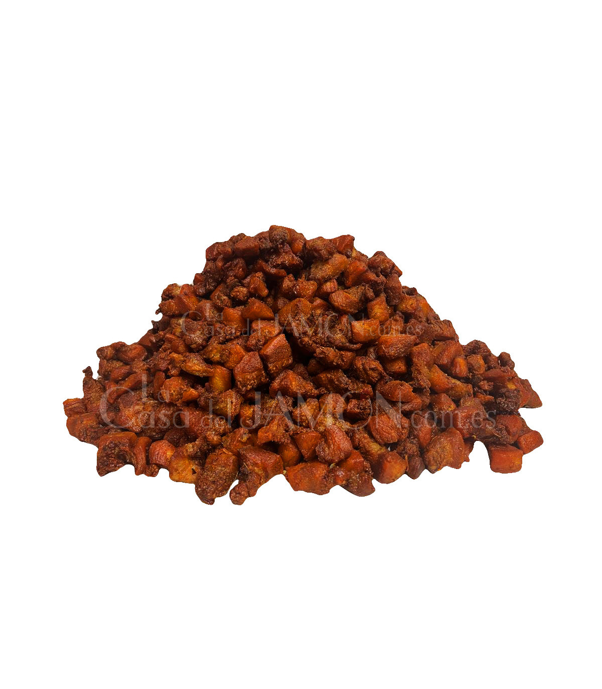 Carrés de porc ibérique frits. Fabriquées avec des épices et frits lentement dans du saindoux, les carrés de porc sont un vrai délice chez La Casa Del Jamón. Vous pouvez les acheter emballés sous vide ou si vous préférez dans un pot.