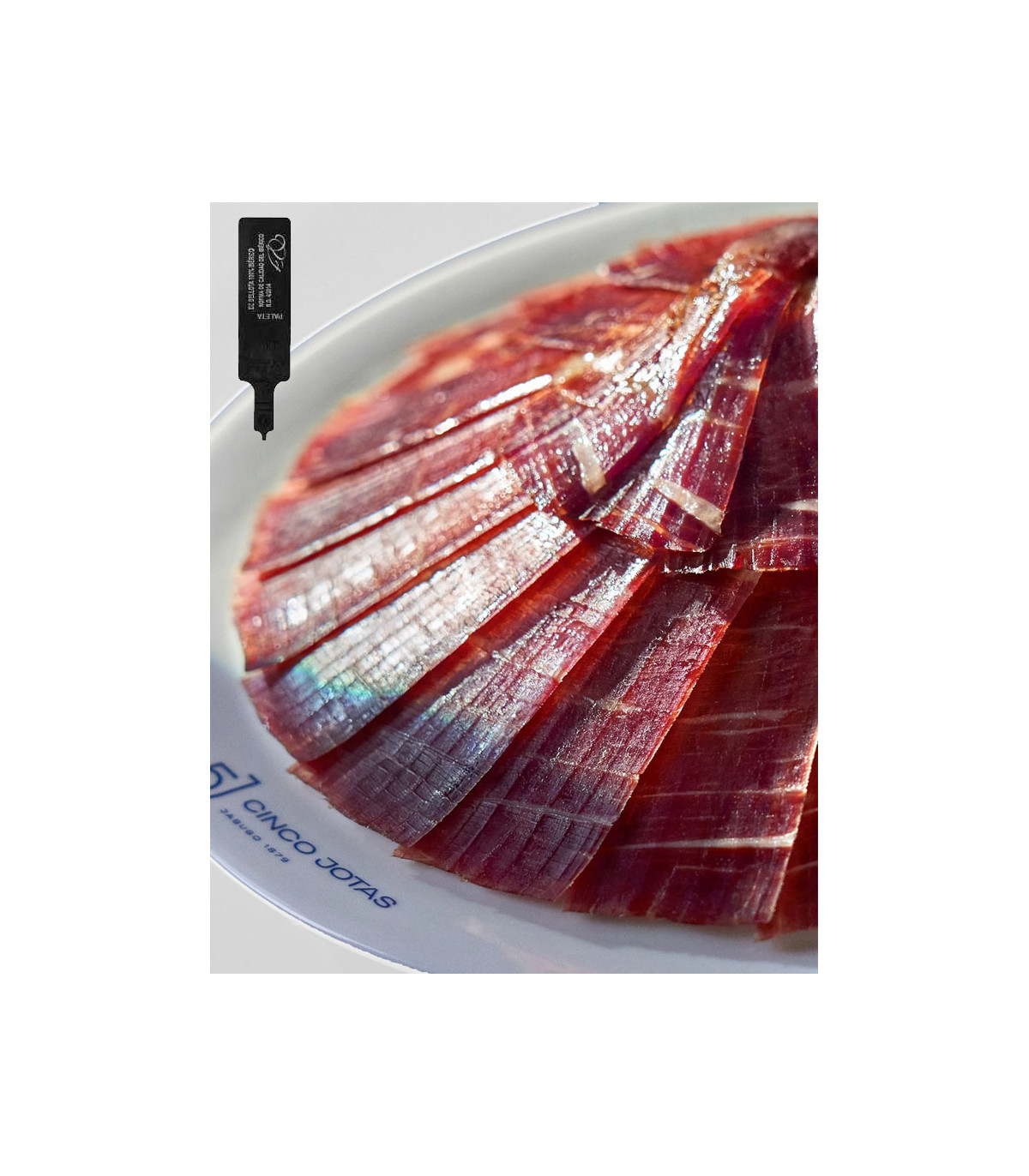 Jambon Pata Negra 5J tranché artisanalement à couteau.